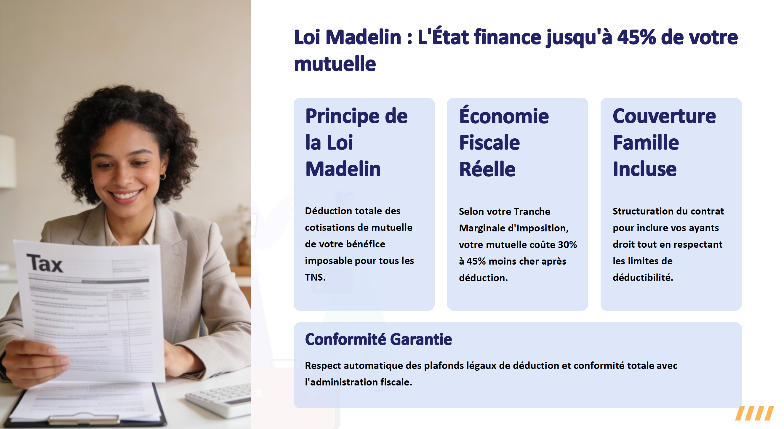Transformez votre mutuelle en investissement stratégique avec une optimisation fiscale jusqu'à 45% grâce à la Loi Madelin.